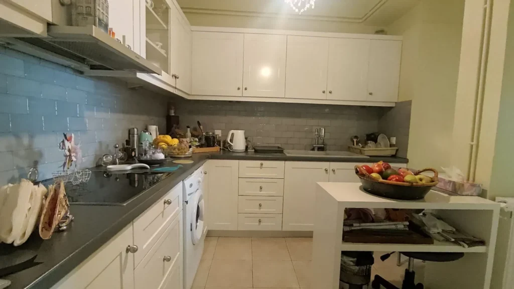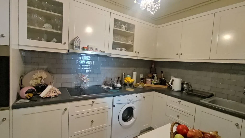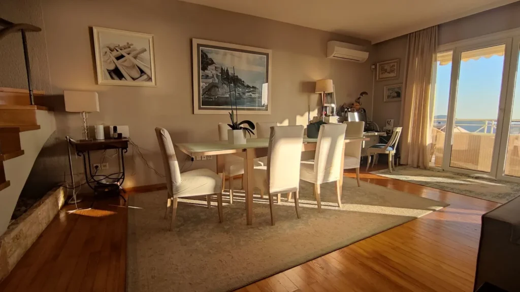 The fully equipped gourmet kitchen is a chef’s dream, fitted with high-end appliances, sleek cabinetry, and a large central island with bar seating. It opens seamlessly onto the dining area, where a stylish dining table comfortably seats eight guests — perfect for family dinners or intimate gatherings.